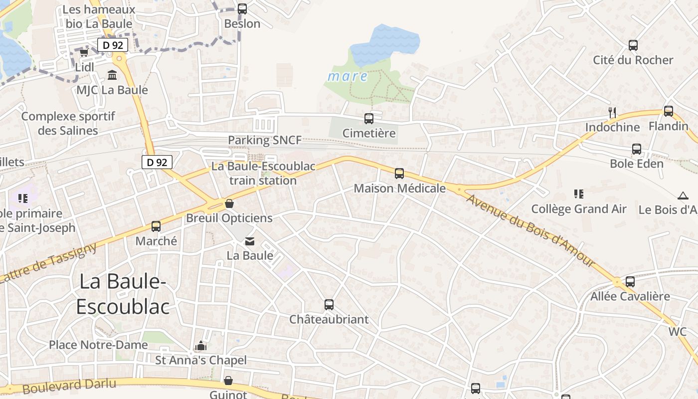 Cette villa se trouve à moins de 25 km de Saint-Nazaire-Montoir et à 15 minutes en voiture de points d'intérêt culturels tels que le Musée de la Poupée et des Jouets Anciens. Le Petit train la Baule Pornichet est niché à moins de 800 mètres de villa et la Cité Médiévale de Guérande est dans une zone de 6 km. Située à environ 6 km de Collégiale Saint-Aubin de Guérande, la propriété est une destination populaire auprès des fidèles et des touristes.